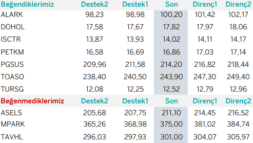 Günlük Bazda Yatırım Fikirleri’nde yer alan hisselerde günlük performans baz alındığından, yatırımcılar ilk aşamada %0.9-%2, ikinci aşamada %3.1-%4 aralıklarını pozisyon kapatma ve/veya kar alma seviyeleri olarak takip edebilirler.