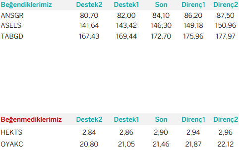 Günlük Bazda Yatırım Fikirleri’nde yer alan hisselerde günlük performans baz alındığından, yatırımcılar ilk aşamada %0.9-%2, ikinci aşamada %3.1-%4 aralıklarını pozisyon kapatma ve/veya kar alma seviyeleri olarak takip edebilirler.