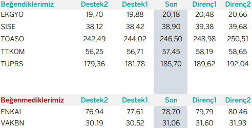 Günlük Bazda Yatırım Fikirleri’nde yer alan hisselerde günlük performans baz alındığından, yatırımcılar ilk aşamada %0.9-%2, ikinci aşamada %3.1-%4 aralıklarını pozisyon kapatma ve/veya kar alma seviyeleri olarak takip edebilirler.