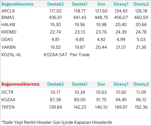 Günlük Bazda Yatırım Fikirleri’nde yer alan hisselerde günlük performans baz alındığından, yatırımcılar ilk aşamada %0.9-%2, ikinci aşamada %3.1-%4 aralıklarını pozisyon kapatma ve/veya kar alma seviyeleri olarak takip edebilirler.