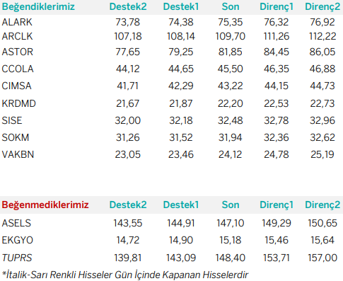 Günlük Bazda Yatırım Fikirleri’nde yer alan hisselerde günlük performans baz alındığından, yatırımcılar ilk aşamada %0.9-%2, ikinci aşamada %3.1-%4 aralıklarını pozisyon kapatma ve/veya kar alma seviyeleri olarak takip edebilirler.