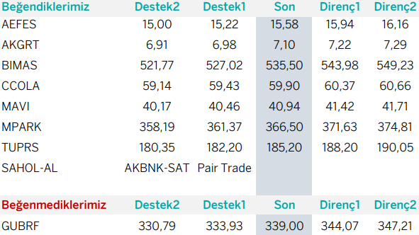 Günlük Bazda Yatırım Fikirleri’nde yer alan hisselerde günlük performans baz alındığından, yatırımcılar ilk aşamada %0.9-%2, ikinci aşamada %3.1-%4 aralıklarını pozisyon kapatma ve/veya kar alma seviyeleri olarak takip edebilirler.