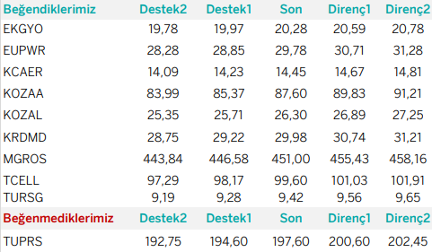 Günlük Bazda Yatırım Fikirleri’nde yer alan hisselerde günlük performans baz alındığından, yatırımcılar ilk aşamada %0.9-%2, ikinci aşamada %3.1-%4 aralıklarını pozisyon kapatma ve/veya kar alma seviyeleri olarak takip edebilirler.