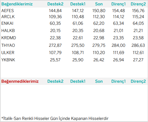Günlük Bazda Yatırım Fikirleri’nde yer alan hisselerde günlük performans baz alındığından, yatırımcılar ilk aşamada %0.9-%2, ikinci aşamada %3.1-%4 aralıklarını pozisyon kapatma ve/veya kar alma seviyeleri olarak takip edebilirler.