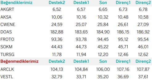 Günlük Bazda Yatırım Fikirleri’nde yer alan hisselerde günlük performans baz alındığından, yatırımcılar ilk aşamada %0.9-%2, ikinci aşamada %3.1-%4 aralıklarını pozisyon kapatma ve/veya kar alma seviyeleri olarak takip edebilirler.