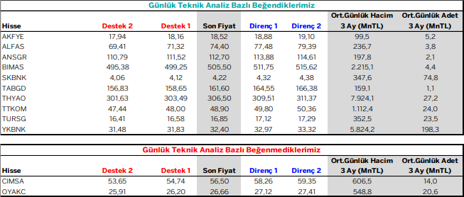 Günlük Teknik Analiz Bazlı Beğendiklerimiz / Beğenmediklerimiz