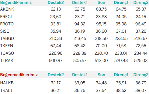 Günlük Bazda Yatırım Fikirleri’nde yer alan hisselerde günlük performans baz alındığından, yatırımcılar ilk aşamada %0.9-%2, ikinci aşamada %3.1-%4 aralıklarını pozisyon kapatma ve/veya kar alma seviyeleri olarak takip edebilirler.