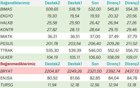Günlük Bazda Yatırım Fikirleri’nde yer alan hisselerde günlük performans baz alındığından, yatırımcılar ilk aşamada %0.9-%2, ikinci aşamada %3.1-%4 aralıklarını pozisyon kapatma ve/veya kar alma seviyeleri olarak takip edebilirler.