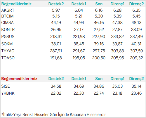 Günlük Bazda Yatırım Fikirleri’nde yer alan hisselerde günlük performans baz alındığından, yatırımcılar ilk aşamada %0.9-%2, ikinci aşamada %3.1-%4 aralıklarını pozisyon kapatma ve/veya kar alma seviyeleri olarak takip edebilirler.