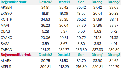 Günlük Bazda Yatırım Fikirleri’nde yer alan hisselerde günlük performans baz alındığından, yatırımcılar ilk aşamada %0.9-%2, ikinci aşamada %3.1-%4 aralıklarını pozisyon kapatma ve/veya kar alma seviyeleri olarak takip edebilirler.