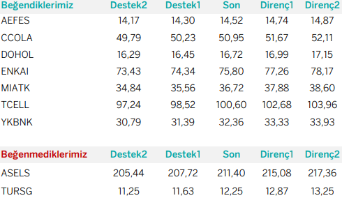 Günlük Bazda Yatırım Fikirleri’nde yer alan hisselerde günlük performans baz alındığından, yatırımcılar ilk aşamada %0.9-%2, ikinci aşamada %3.1-%4 aralıklarını pozisyon kapatma ve/veya kar alma seviyeleri olarak takip edebilirler.