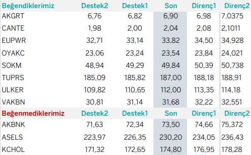 Günlük Bazda Yatırım Fikirleri’nde yer alan hisselerde günlük performans baz alındığından, yatırımcılar ilk aşamada %0.9-%2, ikinci aşamada %3.1-%4 aralıklarını pozisyon kapatma ve/veya kar alma seviyeleri olarak takip edebilirler.