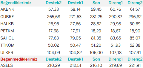 Günlük Bazda Yatırım Fikirleri’nde yer alan hisselerde günlük performans baz alındığından, yatırımcılar ilk aşamada %0.9-%2, ikinci aşamada %3.1-%4 aralıklarını pozisyon kapatma ve/veya kar alma seviyeleri olarak takip edebilirler.