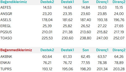 Günlük Bazda Yatırım Fikirleri’nde yer alan hisselerde günlük performans baz alındığından, yatırımcılar ilk aşamada %0.9-%2, ikinci aşamada %3.1-%4 aralıklarını pozisyon kapatma ve/veya kar alma seviyeleri olarak takip edebilirler.
