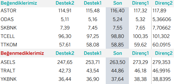 Günlük Bazda Yatırım Fikirleri’nde yer alan hisselerde günlük performans baz alındığından, yatırımcılar ilk aşamada %0.9-%2, ikinci aşamada %3.1-%4 aralıklarını pozisyon kapatma ve/veya kar alma seviyeleri olarak takip edebilirler.