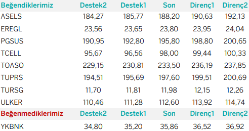 Günlük Bazda Yatırım Fikirleri’nde yer alan hisselerde günlük performans baz alındığından, yatırımcılar ilk aşamada %0.9-%2, ikinci aşamada %3.1-%4 aralıklarını pozisyon kapatma ve/veya kar alma seviyeleri olarak takip edebilirler.