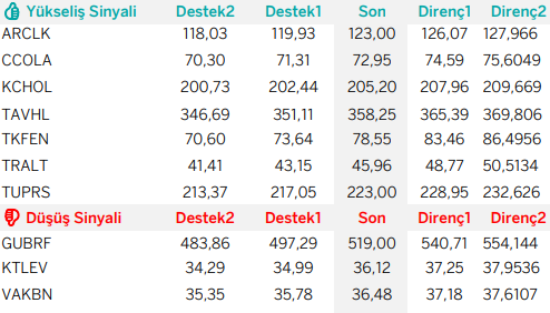 Günlük Bazda Yatırım Fikirleri’nde yer alan hisselerde günlük performans baz alındığından, yatırımcılar ilk aşamada %0.9-%2, ikinci aşamada %3.1-%4 aralıklarını pozisyon kapatma ve/veya kar alma seviyeleri olarak takip edebilirler.
