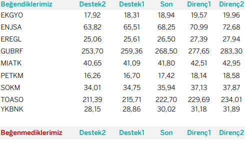 Günlük Bazda Yatırım Fikirleri’nde yer alan hisselerde günlük performans baz alındığından, yatırımcılar ilk aşamada %0.9-%2, ikinci aşamada %3.1-%4 aralıklarını pozisyon kapatma ve/veya kar alma seviyeleri olarak takip edebilirler.