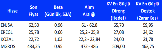 Teknik takibimizde olan hisseler için uygun alım aralıkları, hedef fiyat ve zarar kes seviyeleri tamamen teknik analiz dinamikleri göz önünde bulundurularak belirlenmektedir. Piyasa koşullarındaki genel değişimlerin bu hisseleri de BETA’ları oranınca etkilemesi beklenebilir.