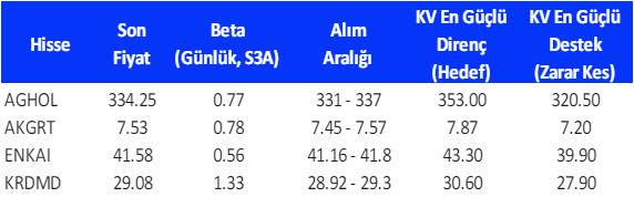 Her ay başında düzenli olarak yayınladığımız Aylık Bülten’lerde «Teknik Takibimizde Olan Hisseler»i paylaşmaktayız. Bu kapsamda yapılan hisse seçiminde teknik dinamikler baz alınmakta olup, belirtilen işlem koşullarının gerçekleşmesi durumunda ilgili hisselerin aylık bazda BIST 100’e kıyasla aylık getirilerinin daha yüksek olacağı öngörülmektedir. Teknik takibimizde olan hisseler için uygun alım aralıkları, hedef fiyat ve zarar kes seviyeleri tamamen teknik analiz dinamikleri göz önünde bulundurularak belirlenmektedir. Piyasa koşullarındaki genel değişimlerin bu hisseleri de BETA’ları oranınca etkilemesi beklenebilir.