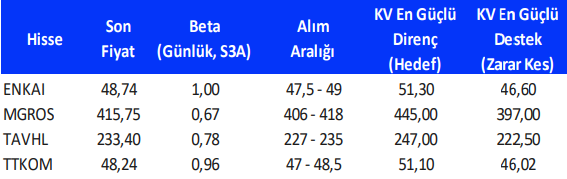 Teknik takibimizde olan hisseler için uygun alım aralıkları, hedef fiyat ve zarar kes seviyeleri tamamen teknik analiz dinamikleri göz önünde bulundurularak belirlenmektedir. Piyasa koşullarındaki genel değişimlerin bu hisseleri de BETA’ları oranınca etkilemesi beklenebilir.