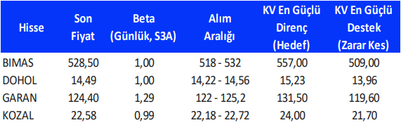 Teknik takibimizde olan hisseler için uygun alım aralıkları, hedef fiyat ve zarar kes seviyeleri tamamen teknik analiz dinamikleri göz önünde bulundurularak belirlenmektedir. Piyasa koşullarındaki genel değişimlerin bu hisseleri de BETA’ları oranınca etkilemesi beklenebilir.