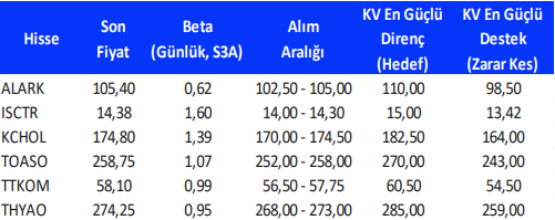 Teknik takibimizde olan hisseler için uygun alım aralıkları, hedef fiyat ve zarar kes seviyeleri tamamen teknik analiz dinamikleri göz önünde bulundurularak belirlenmektedir. Piyasa koşullarındaki genel değişimlerin bu hisseleri de BETA’ları oranınca etkilemesi beklenebilir.