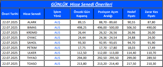 ➢ Önerilerin geçerlilik süresi raporda verilen tarihle sınırlıdır. Verilen tarih içinde hedef ve stop seviyesine ulaşmayan hisseler öneri bitiş tarihindeki kapanış fiyatından kapatılmış sayılır ve bunlar için ek bir bildirim yapılmaz.