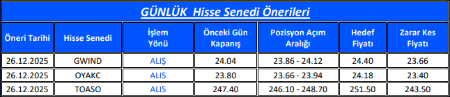 ➢ Önerilerin geçerlilik süresi raporda verilen tarihle sınırlıdır. Verilen tarih içinde hedef ve stop seviyesine ulaşmayan hisseler öneri bitiş tarihindeki kapanış fiyatından kapatılmış sayılır ve bunlar için ek bir bildirim yapılmaz.