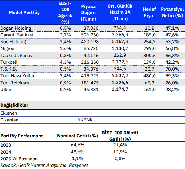 Önemli Not: Gedik Yatırım Model Portföy’ü asgari 7 ve azami 15 adet hisse senedinden oluşur. Ağırlıklar, istisnai durumlar dışında tüm hisseler için %10’dur. Portföyde 10 hissenin altında bulunması durumunda boşluklar BIST-100 ile doldurulur.