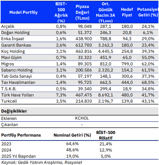 Önemli Not: Gedik Yatırım Model Portföy’ü asgari 7 ve azami 15 adet hisse senedinden oluşur. Ağırlıklar, istisnai durumlar dışında tüm hisseler için %10’dur. Portföyde 10 hissenin altında bulunması durumunda boşluklar BIST-100 ile doldurulur.