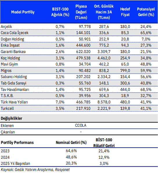 Önemli Not: Gedik Yatırım Model Portföy’ü asgari 7 ve azami 15 adet hisse senedinden oluşur. Ağırlıklar, istisnai durumlar dışında tüm hisseler için %10’dur. Portföyde 10 hissenin altında bulunması durumunda boşluklar BIST-100 ile doldurulur.
