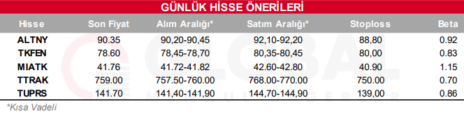 Bugün hareketli olmasını beklediğimiz hisseler: ALTNY, TKFEN, MIATK, TTRAK, TUPRS.