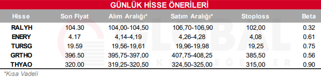 Bugün hareketli olmasını beklediğimiz hisseler: RALYH, ENERY, TURSG, GRTHO, THYAO.