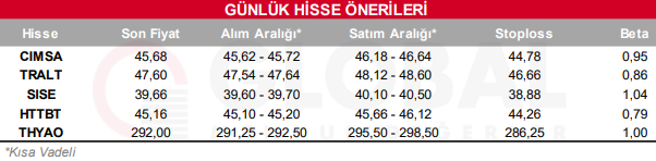 Bugün hareketli olmasını beklediğimiz hisseler: CIMSA, TRALT, SISE, HTTBT, THYAO