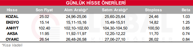Bugün hareketli olmasını beklediğimiz hisseler: KOZAL, EKGYO, ANHYT, AKSA, OYAKC.