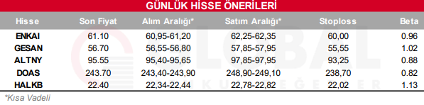 Bugün hareketli olmasını beklediğimiz hisseler: ENKAI, GESAN, ALTNY, DOAS, HALKB.