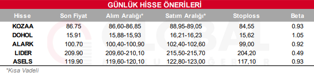 Bugün hareketli olmasını beklediğimiz hisseler: KOZAA, DOHOL, ALARK, LIDER, ASELS.
