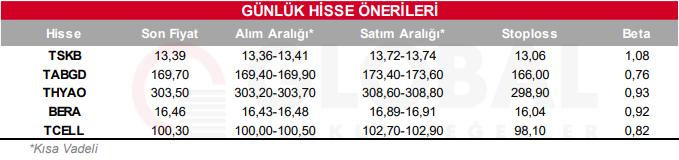 Bugün hareketli olmasını beklediğimiz hisseler: TSKB, TABGD, THYAO, BERA, TCELL.
