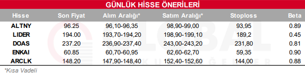 Bugün hareketli olmasını beklediğimiz hisseler: ALTNY, LIDER, DOAS, ENKAI, ARCLK.