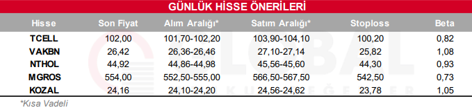 Bugün hareketli olmasını beklediğimiz hisseler: TCELL, VAKBN, NTHOL, MGROS, KOZAL.