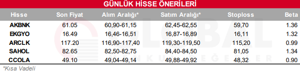 Bugün hareketli olmasını beklediğimiz hisseler: AKBNK-EKGYO-ARCLK-SAHOL-CCOLA