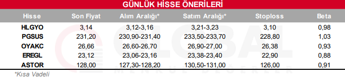 Bugün hareketli olmasını beklediğimiz hisseler: HLGYO, PGSUS, OYAKC, EREGL, ASTOR.
