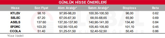 Bugün hareketli olmasını beklediğimiz hisseler: KTLEV, SELEC, ASELS, EFORC, CCOLA.