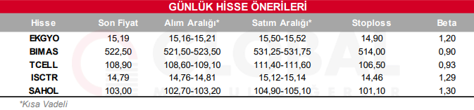 Bugün hareketli olmasını beklediğimiz hisseler: EKGYO, BIMAS, TCELL, ISCTR, SAHOL.