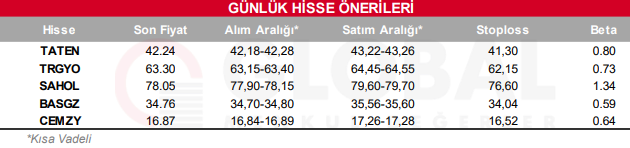 Bugün hareketli olmasını beklediğimiz hisseler: TATEN, TRGYO, SAHOL, BASGZ, CEMZY.