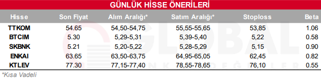 Bugün hareketli olmasını beklediğimiz hisseler: TTKOM, BTCIM, SKBNK, ENKAI, KTLEV.