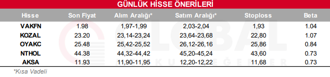 Bugün hareketli olmasını beklediğimiz hisseler: VAKFN, KOZAL, OYAKC, NTHOL, AKSA.