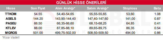 Bugün hareketli olmasını beklediğimiz hisseler: TTKOM, ASELS, PASEU, KTLEV, MGROS.
