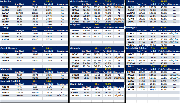 Not: Yukarıda yer alan hedef fiyatlar, potansiyel getiriler ve konsensus önerileri, Halk Yatırım öneri ve beklentileri değildir. Bu veriler, Reuters, Matriks, Bloomberg vb. güvenilir olduğuna inanılan ve en az 3 analist tarafından paylaşılan hedef fiyat ve tavsiyeler olup bilgi paylaşımı amacıyla listelenmiştir.